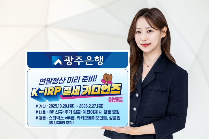 [무한뉴스=정민정 기자] 광주은행은 20일, 연말정산 시즌을 맞아 절세 혜택을 받을 수 있는 연금계좌 활용법에 대한 관심이 높아짐에 따라, 개인형 IRP(개인형퇴직연금) 고객을 대상으로 ‘K-IRP 절세 가디언즈’이벤트를 실시한다고 밝혔다.