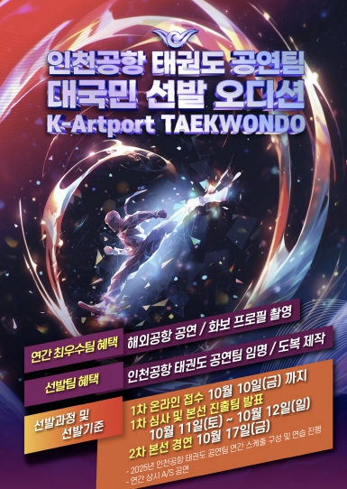 [무한뉴스=정승훈 기자] 인천국제공항공사는 인천공항에서 진행되는 태권도 상설공연인 ‘2025-2026 인천공항 태권도 상설공연’에 참여할 태권도 전문 공연팀을 공개 모집한다고 28일 밝혔다.