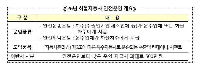 이번 의결을 통해 고시될 ‘26년 적용 안전운임의 주요 내용은 다음과 같다.