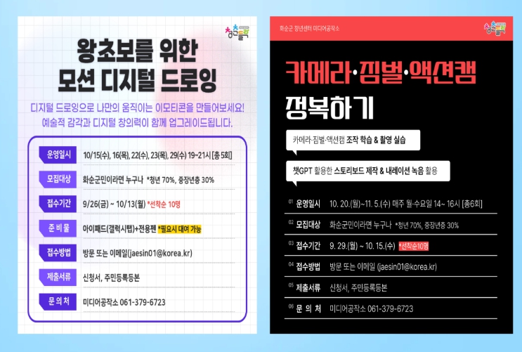 [무한뉴스=정민정 기자] 화순군(군수 구복규)은 오는 10월 15일과 20일 화순군 청년센터(청춘들락) 미디어공작소에서 영상 제작과 디지털드로잉 분야의 창의적 미디어 교육 프로그램을 시작한다고 밝혔다.
