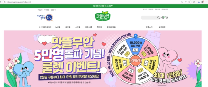 10월 20일부터 시작되는 룰렛 이벤트는 ‘맛뜰무안몰’ 회원 누구나 참여할 수 있으며, 룰렛을 돌려 최대 1만원의 할인쿠폰을 무작위로 제공한다.