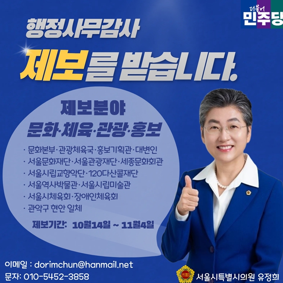 [무한뉴스=양현명 기자] 서울특별시의회 문화체육관광위원회 유정희 의원(더불어민주당, 관악4)은 10월 14일부터 11월 4일까지 시민 의견을 직접 접수받는 ‘행정사무감사 시민제보창구’를 운영한다고 밝혔다.