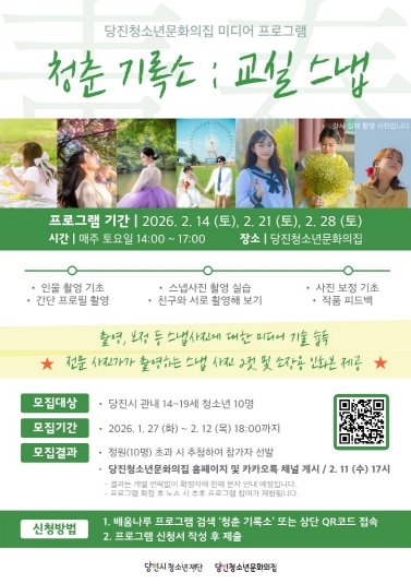 [무한뉴스=정민정 기자] (재)당진시청소년재단 당진청소년문화의집(관장 유수민)은 오는 2월 14일부터 28일까지 매주 토요일, 14시부터 17시까지 관내 14~19세 청소년을 대상으로 미디어 프로그램 [청춘 기록소 : 교실 스냅]을 운영할 예정이다.