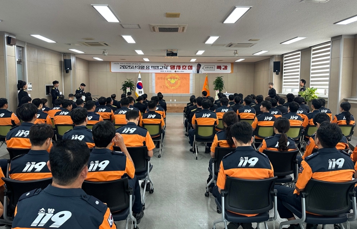 [무한뉴스=정민정 기자] 여수소방서는 9월 19일 본서에서 소방공무원의 현장대응 능력 향상과 안전한 소방문화 정착을 위한 2025년 9월 중 직장교육훈련을 실시했다. 여수소방서는 소방공무원들의 역량 강화를 위해 분기별로 다양한 주제를 선정해 체계적인 직장교육을 꾸준히 실시하고 있다.