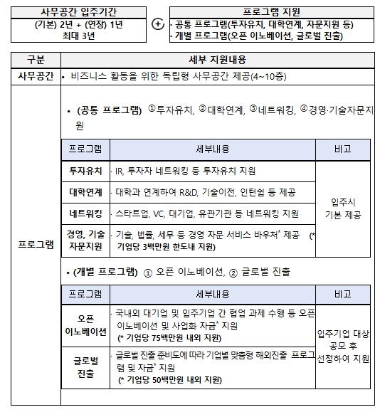 이번에 모집하는 입주기업은 K-StartHub 개관 이후 처음으로 입주를 시작하는 기업들로 사업의 시작을 함께하게 된다. 입주기업은 독립형 사무공간을 비롯해 회의실, 라운지 등 업무 인프라가 제공되며, 비입주기업도 멤버십 형태로 공유오피스를 이용할 수 있다. 또한, 창업기업들의 원활한 경영을 위해 기술·법률·세무 등에 관한 자문 서비스, 오픈이노베이션·글로벌 진출·투자 연계 등 스케일업 프로그램도 함께 지원받을 수 있다.