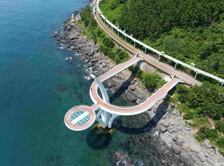 하루 평균 1천500여 명이 찾는 관광명소 해월전망대는 해운대블루라인파크 미포 정거장에서 청사포 방향으로 1.1km 떨어진 곳에 있다. 길이 137m, 폭 3~5m, 높이 22m로, U자형 통로 끝에 초승달 모양의 주탑과 LED 조명이 달린 직경 15m 원형 광장이 있다.