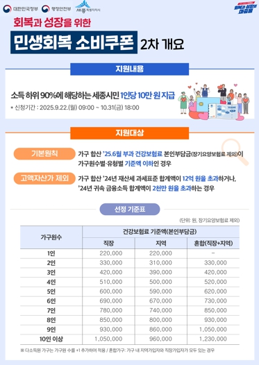 2025년 6월 부과된 건강보험료 본인부담금 합산액이 가구원수별·유형별 기준액 이하여야 2차 소비쿠폰 지급 대상에 포함된다.