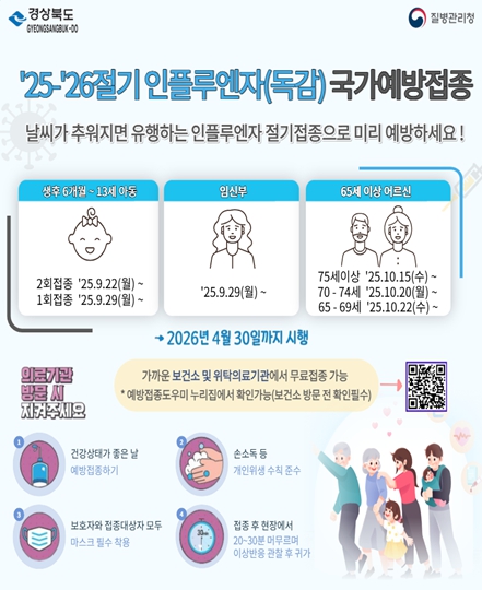 [무한뉴스=최진수 기자] 경상북도는 다가오는 겨울철 인플루엔자 유행에 대비해 22일부터 내년 4월 30일까지 고위험군을 대상으로 2025년~2026년 절기 인플루엔자 국가 예방접종을 한다.