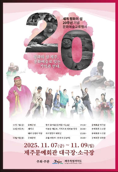 [무한뉴스=정민정 기자] 제주특별자치도는 세계평화의 섬 20주년을 기념해 ‘평화의 섬 제주, 문화예술로 잇는 기억과 연대' 주제로 7일부터 9일까지 3일간 제주문예회관에서 문화예술 교류 행사를 개최한다.