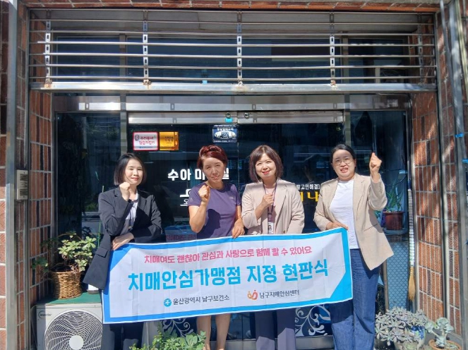 [무한뉴스=최진수 기자] 울산광역시 남구 치매안심센터는 치매 환자와 더불어 살아갈 수 있는 치매 친화적 환경 조성에 앞장서기 위해 23일 삼호동 수아미용실, 진정화로숯불구이 2개소를 신규 치매안심가맹점으로 지정하고 현판식을 진행했다.