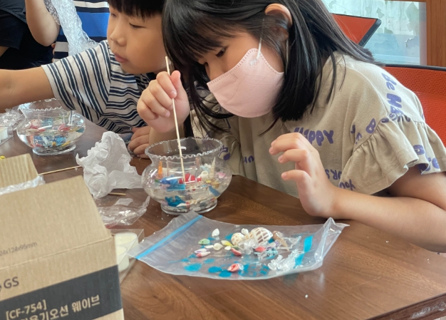 참가자들은 색모래, 바다 생물 피규어, 조개, 펄 장식 등 다양한 재료를 활용해 젤 캔들을 자유롭게 꾸몄으며, 강사가 체험 중간마다 녹인 젤 왁스를 안전하게 부어주며 작품의 완성도를 높였다. 이러한 방식은 참여자들이 보다 몰입감 있게 체험에 집중할 수 있도록 도왔으며, 안전성도 함께 확보할 수 있었다.