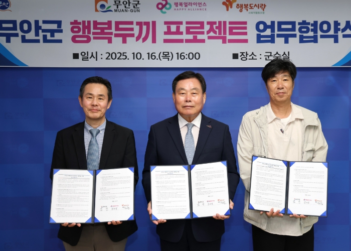 [무한뉴스=정민정 기자] 전남 무안군은 지난 16일 무안군청 군수실에서 행복얼라이언스 및 행복도시락사회적협동조합과 함께 결식 우려 아동을 위한 '행복두끼 프로젝트' 업무협약을 체결했다.