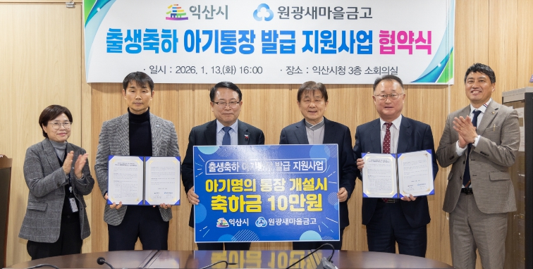 협약에 따라 원광새마을금고는 올해 익산시에서 출생한 아기 명의로 통장을 개설하면 축하금 10만 원을 지원하고, 시는 시민들이 혜택을 받을 수 있도록 읍면동 행정복지센터와 유관기관 등을 통해 적극적인 홍보에 나선다.