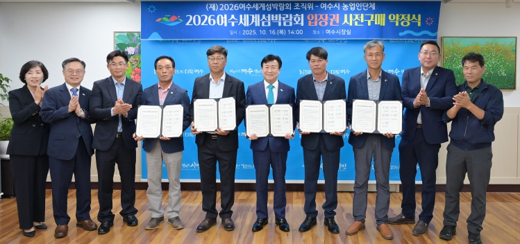 [무한뉴스=정민정 기자] (재)2026여수세계섬박람회조직위원회는 지난 16일 여수시청 시장실에서 여수 농업인 단체와 2026여수세계섬박람회 입장권 1,500만 원 규모의 사전 구매 약정을 체결했다고 밝혔다.