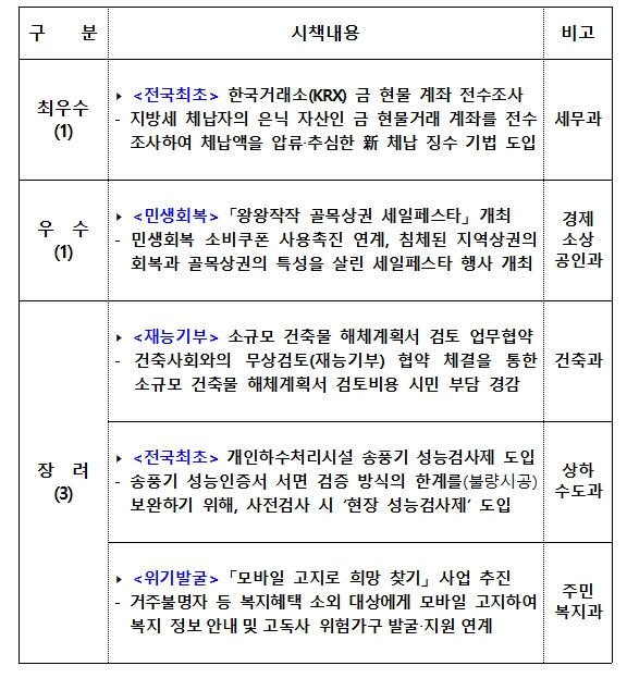 선정된 우수 시책 5건을 구체적으로 살펴보면’최우수’ 시책으로는 세무과의 '전국 최초, 한국거래소(KRX) 금 현물 계좌 전수조사'가 선정됐다.