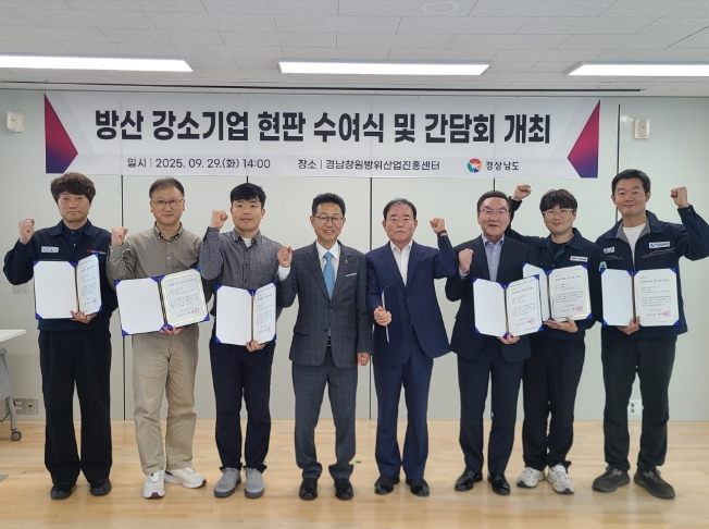 [무한뉴스=최진수 기자] 경상남도는 29일 경남창원방위산업진흥센터에서 ‘2025년 방산 강소기업 지정 현판식 및 기업 간담회’를 개최했다.