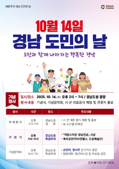 [무한뉴스=최진수 기자] 경상남도는 10월 14일 오후 2시부터 7시까지 경남도청 광장 일원에서 ‘제42회 도민의 날’ 행사를 개최한다고 밝혔다.