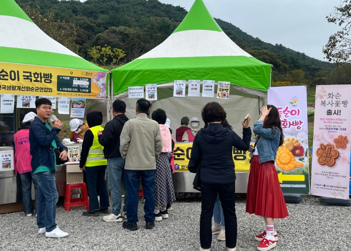 | ▲ 2025 화순고인돌가을꽃축제 현장에서 ‘복사꽃빵’을 홍보·판매 중인 한국생활개선화순군연합회 회원들 모습. |