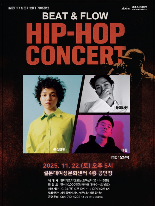 [무한뉴스=정민정 기자] 제주특별자치도 설문대여성문화센터는 ‘설문대 문화의 날’ 11월 기획공연으로 ‘원슈타인·블랙나인·마린 힙합콘서트’를 11월 22일 오후 5시에 공연장에서 선보인다고 밝혔다.