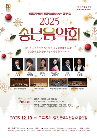 [무한뉴스=정민정 기자] (재)당진문화재단·당진문예의전당(대표이사 이원철)은 오는 12월 13일 토요일 오후 5시, 당진문예의전당 대공연장에서 '2025 송년음악회'를 개최한다. 이번 공연은 충청남도와 당진시, 당진문화재단이 주최하고, 당진문화재단·당진문예의전당, 공주시충남교향악단, 당진시충남합창단이 공동주관한다.