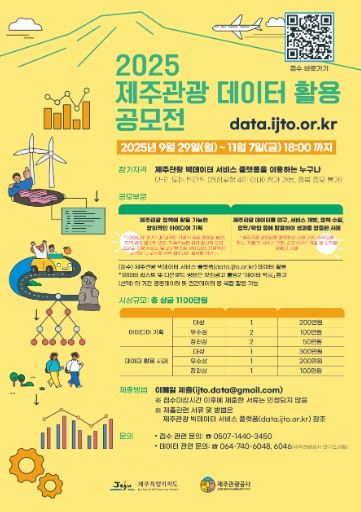 [무한뉴스=정민정 기자] 제주특별자치도와 제주관광공사는 오는 11월 7일까지 온라인 채널을 통해 ‘2025년 제주관광 데이터 활용 공모전’ 참가자를 모집하고 있다고 2일 밝혔다.
