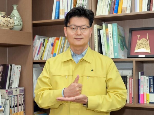김 시장은 엄지손가락을 편 오른손을 왼손으로 받치는 수어 동작을 취하고 “코로나19에 맞서 치열하게 싸우고 있는 모든 의료진과 관계자에게 존경과 감사의 마음을 담아 응원한다”는 메시지를 전달했다.