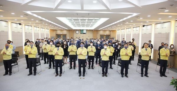 [무한뉴스] 맹정호 서산시장과 서산시 공무원들이 4일 월례회의에서 코로나19 환자 진료와 치료에 힘쓰고 있는 의료진들을 응원하는 릴레이 캠페인 ‘덕분에 챌린지’에 동참했다.