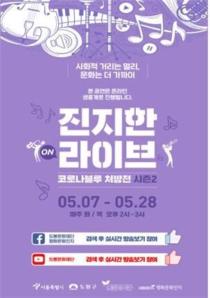 [무한뉴스] 도봉구 도봉문화재단이 코로나19 바이러스로 지친 예술인과 주민을 위한 온라인 라이브 공연 ’진지한 라이브-코로나블루 처방전 시즌2‘를 5월 7일부터 한 달간 연장해 진행한다.