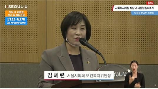 [무한뉴스] 서울시의회 보건복지위원회 김혜련 위원장은 7일 오후 2시 서울시청 6층 영상회의실에서 서울시인권담당관이 주최한 “사회복지시설 직장 내 괴롭힘 실태조사 결과 무청중 온라인 토론회”에 참석했다.