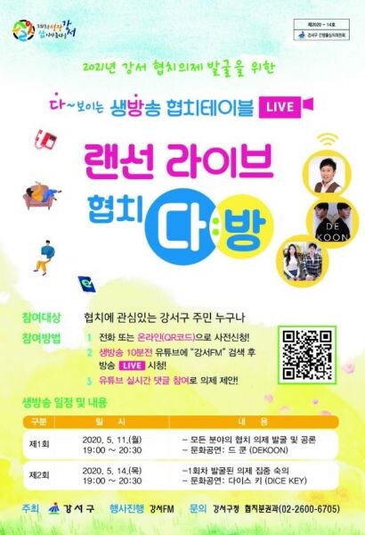 주민 누구나 참여 가능하며 생방송 10분 전 ‘유튜브’에서 ‘강서FM’ 검색 후 LIVE 방송을 시청하면서 댓글로 참여할 수 있다.
