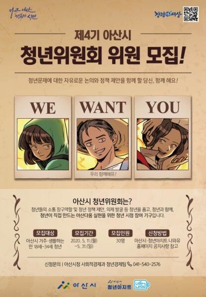 위원으로 참여를 희망하는 청년은 아산시청 또는 청년아지트 나와유 홈페이지에 게시된 신청서를 작성해 오는 5월 31일까지 아산시 사회적경제과 청년경제팀으로 제출하면 된다.