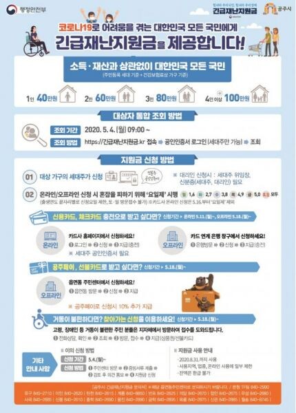 시에 따르면, 이번에 지급되는 정부 긴급재난지원금은 1인 가구 40만원, 2인 가구 60만원, 3인 가구 80만원, 4인 가구 이상은 100만원이다.