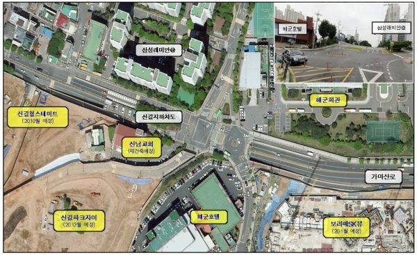 신길지하차도 상부는 평면 교차로 및 회전 교차로가 서로 맞닿아 있어, 차량 통행 시 동선이 겹치며 사고 위험성이 높았다.