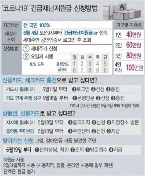 신청은 카드사 금융기관 및 읍면사무소에서 가능하며 접수창구의 혼잡을 줄이고자 세대주 출생년도 끝자리에 따른 신청요일에 가능하다.