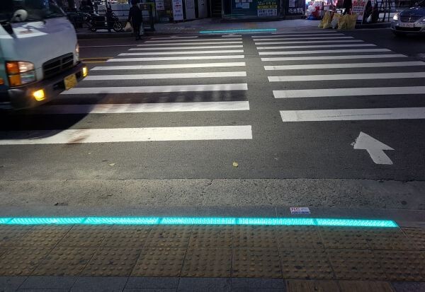 ‘바닥신호등’은 횡단보도에 기존 신호등과 동일한 신호를 바닥에 있는 연석과 시각장애인용 유도블럭 사이에 설치된 LED 패널을 통해 동시 표출하는 보조 신호등이다.