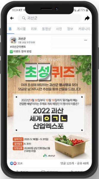 이벤트에 참여하려면 괴산군 공식 SNS를 방문해 초성 맞히기 정답을 댓글로 달고 공유하기와 친구추가를 하면 된다.
