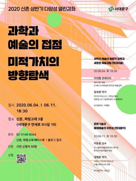 서대문구는 6월 4일과 11일 오후 6시 30분 ‘신촌, 파랑고래’ 3층 ‘꿈이룸홀’에서 ‘과학과 예술의 접점, 미적가치의 방향탐색’이란 주제로 2020 신촌 상반기 다양성 열린강좌를 개최한다.