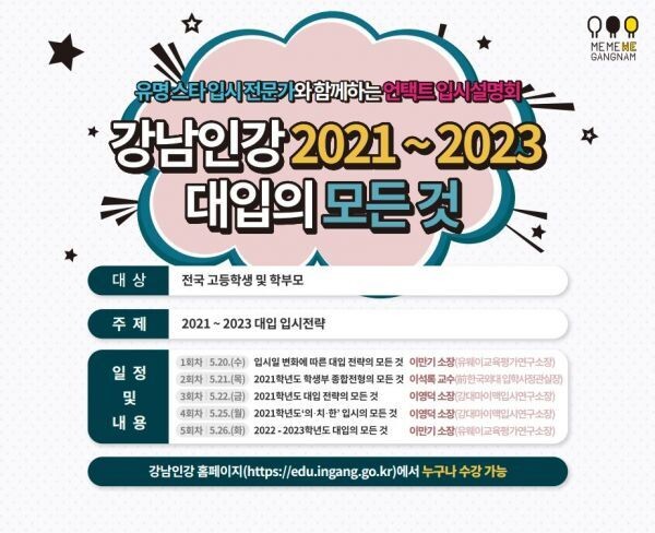 강연은 입시일정 변화에 따른 대입 전략 2021 학생부 종합전형 2021 대입 전략 2021 의·치·한 입시 전략 2022~2023 대입의 모든 것 등 26일까지 총5회 진행되며 강남인강 홈페이지에서 회원가입 절차 없이 누구나 들을 수 있다.