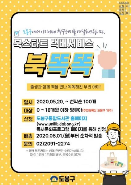[무한뉴스] 도봉구가 코로나19 확산에 따라 영·유아 독서지원을 위한 북스타트 꾸러미를 집에서 안전하게 받아 볼 수 있도록 택배서비스 ‘북똑똑’ 서비스를 시행한다.