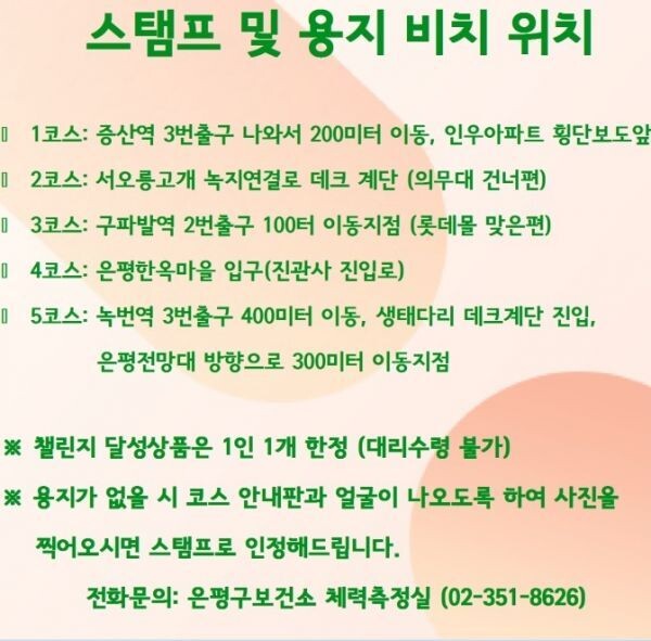 모두의 건강을 위해 사회적 거리도 유지하면서 생활 속 신체활동을 늘리는 방법으로 “나 혼-자 걷기”로 생활 속 거리 두기도 실천하고 나의 건강도 지키자“며 ‘은평둘레길 스탬프 투어’를 운영해 구민들의 많은 참여를 독려하고 있다.