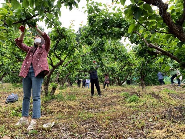 코로나19 장기화로 인력 수급이 어려워진 농가를 돕기 위해 5월 22일 서울시, 도시농업전문가회, 서울시농업지도자회 등 60여명이 노원구와 중랑구 등 ‘서울 먹골배’의 명성을 이어가고 있는 과수 농가를 찾아 일손돕기에 나섰다.
