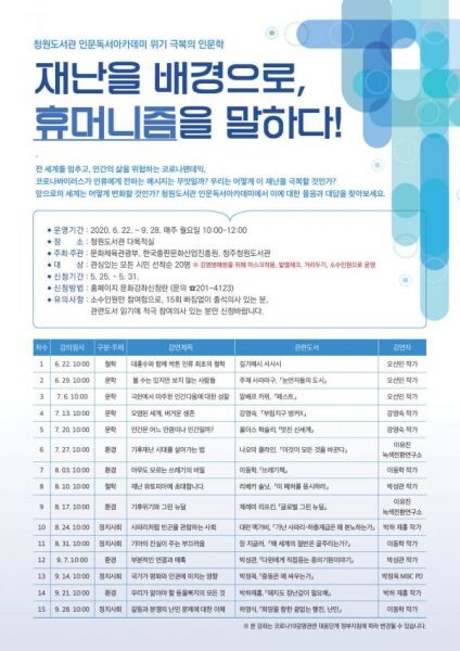 인문독서아카데미는 문화체육관광부 주최, 한국출판문화산업진흥원 주관으로 시민들의 인문정신 고양과 독서문화 확산을 위해 시행하는 공모사업으로 청원도서관은 지난 4월 수행기관으로 선정된 바 있다.
