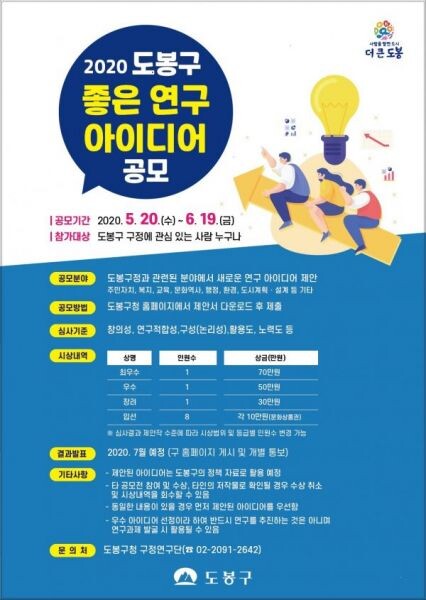 [무한뉴스] 도봉구가 주민이 직접 제안하고 참여하는 구정 아이디어 공모인 '2020 도봉구 좋은 연구 아이디어 공모'를 진행한다.