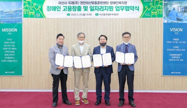 [무한뉴스] 아산시는 지난 25일 아산충무병원에서 두레주식회사, 한국장애인고용공단 천안아산맞춤훈련센터, 아산시장애인복지관과 장애인 고용창출 및 안정적인 일자리 지원을 위한 업무협약을 체결했다.