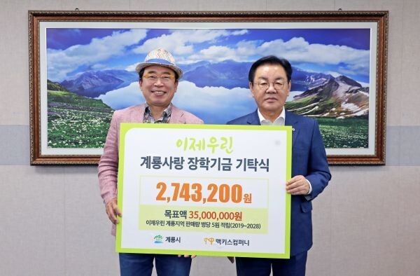 계룡시애향장학회와 ㈜맥키스컴퍼니는 지난해 6월 지역발전과 인재육성을 위해 2028년까지 10년 동안 적립금 3천5백만원을 목표로 계룡시에서 판매되는 ‘이제우린’ 판매량에 따른 적립금을 매년 기탁하기로 협약을 체결한 바 있다.