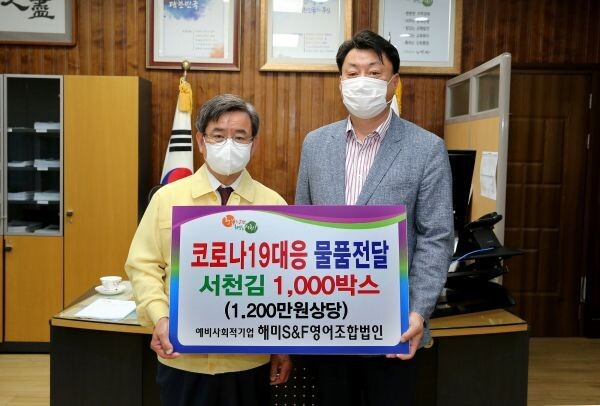 [무한뉴스] 서천군의 예비사회적기업인 해미S&F영어조합법인은 26일 취약계층 어르신을 위해 사용해 달라며 조미김 1000상자를 서천군에 기탁했다.