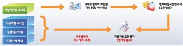 자동차번호판 영치는 해당 자치구에서 영치대상 차량의 번호판을 탈착해 보관하는 제도다.