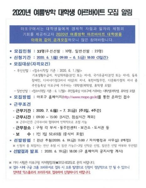여름방학 아르바이트에 신청을 희망하는 대학생은 모집 기간 중 마포구 누리집를 통해 신청하면 된다.