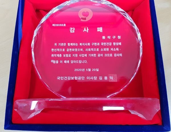 [무한뉴스] 동작구가 지난 28일 국민건강보험공단으로부터 저소득·취약계층 대상 국민건강보험료 지원사업의 적극 추진으로 감사패를 수상했다고 29일 밝혔다.