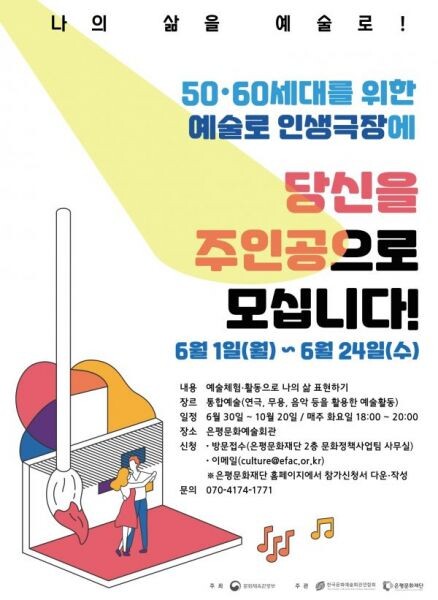 [무한뉴스]은평문화재단은 50,60세대가 문화예술활동을 누릴 수 있는 ‘예술로 인생극장’ 참가자를 지난 1일부터 오는 24일까지 모집한다고 밝혔다.